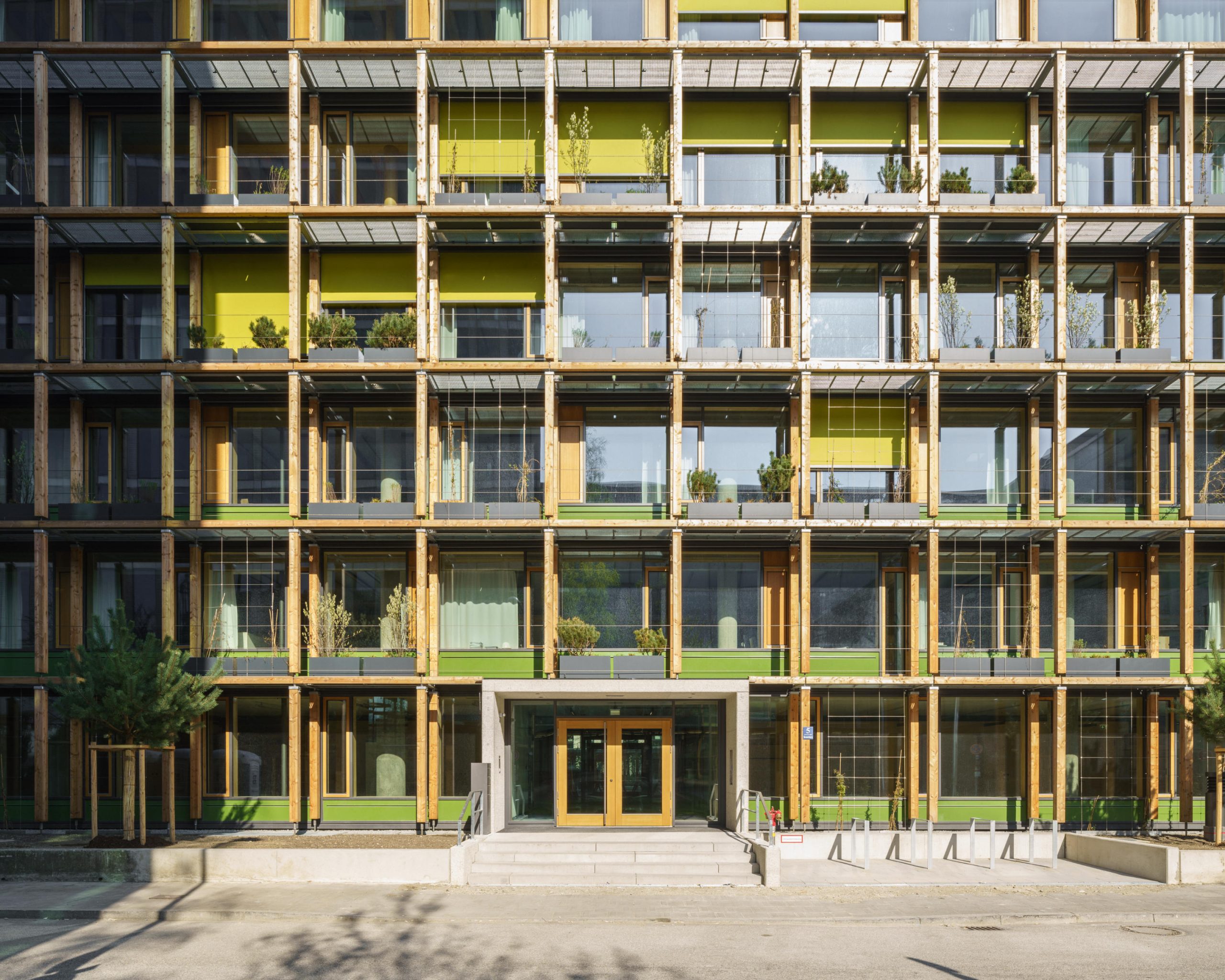 Im Münchner Stadtteil Schwabing leistet die neue Bundesgeschäftsstelle des Deutschen Alpenvereins einen relevanten Beitrag zur Transformation des Gebäudebestands. Die von Element · A Architekten geplante Revitalisierung des viergeschossigen Bestandsbau aus den 1970er-Jahren wurde ressourcenschonend mittels Holz-Massivbauweise um zwei Geschosse, inklusive der Kernzone, aufgestockt. Trotz äußerer Einflüsse wie Lärm- und Emissionsbelastung kommt das Haus ohne Komfortverlust für die Mitarbeitenden mit einer reduzierten Gebäudetechnik aus. Ein neues Atrium verbindet alle Geschosse der von hellem Holz dominierten Arbeitswelt miteinander. Die markante Gebäudehülle aus einer Holz-Pfosten-Riegelfassade und einem vorgelagerten, begrünten Holzgerüst auf zwei Seiten bildet einen wegweisenden Baustein in der von funktionalen Bürobauten dominierten Umgebung.
