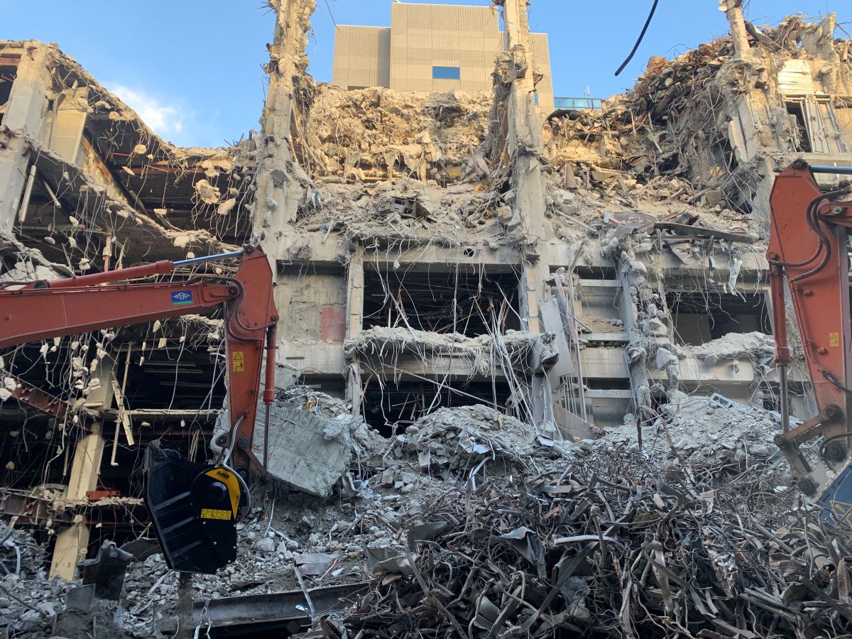 In the center of a large city in Japan the goal was to tear down a 16-floor reinforced concrete building, surrounded by other properties and city life. Compact and agile machines were required to work on the roof of the building to demolish it one floor at a time. The demo waste was then tossed down a hole that was opened in the center of the building, to protect the surrounding area.