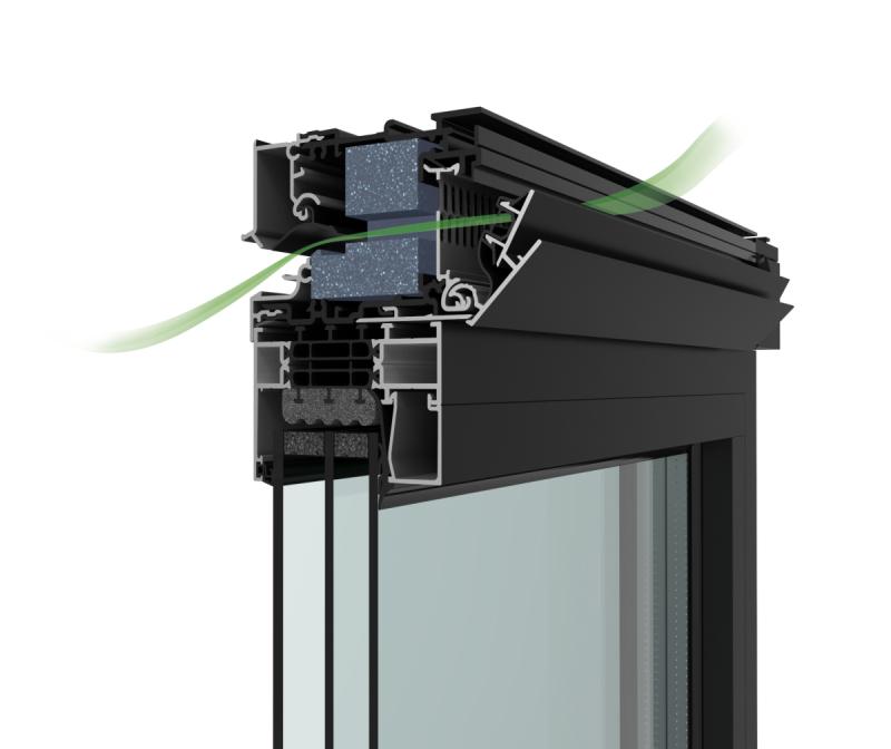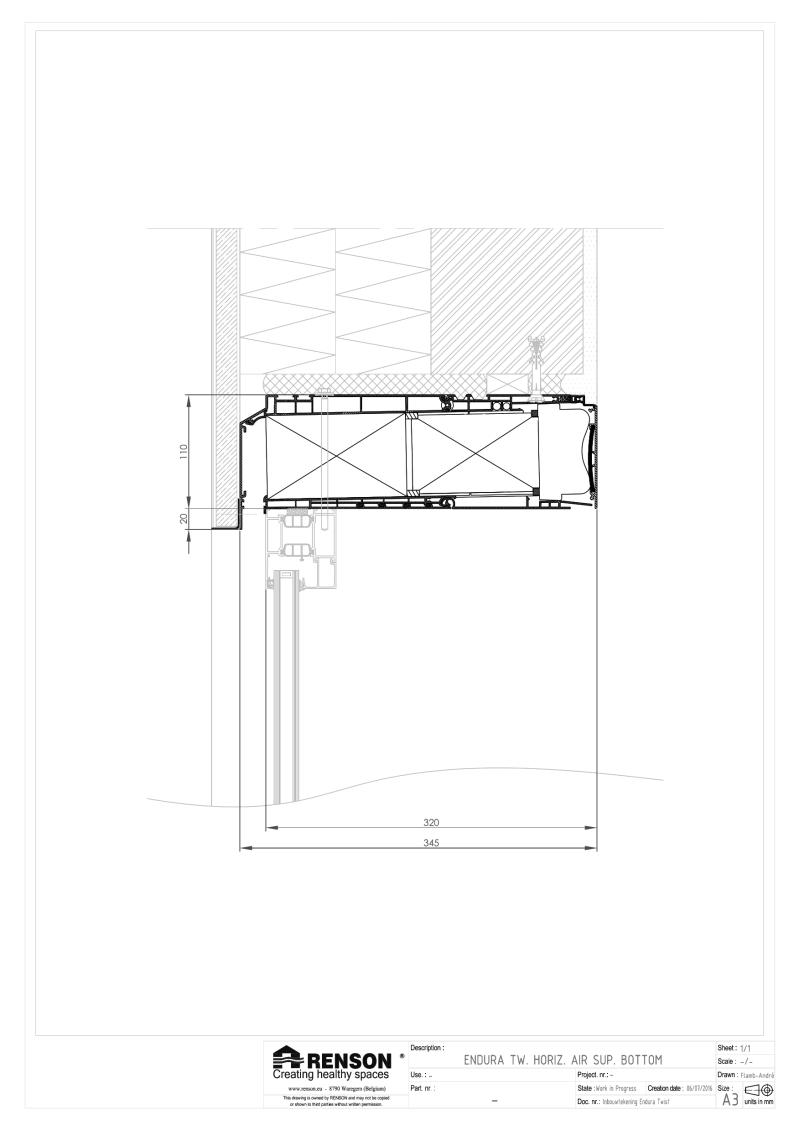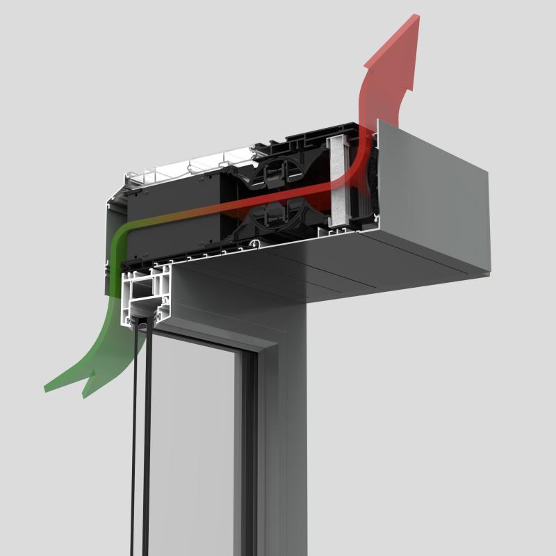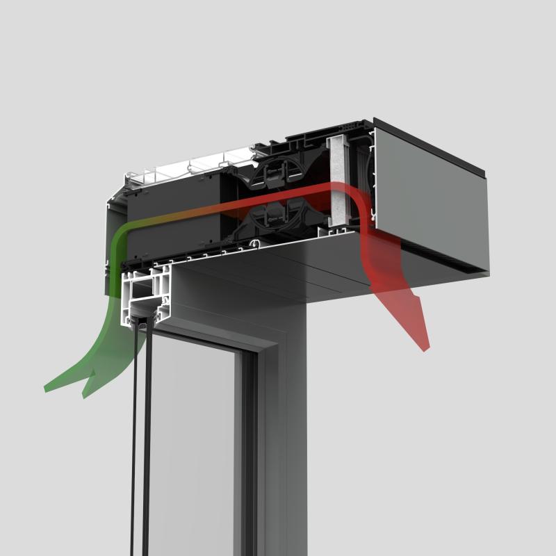 The Endura Twist central unit is only 110 mm high, 345 mm wide and up to 6000 mm long, which means it is also suitable for large sliding window systems or glass fronts. Depending on the installation situation, integrated or visible, various air ducts are possible in the interior: at the top, at the bottom or to the side. The system can be operated without filters, but if necessary can be fitted with G3 filters or F7 fine material filters as well. So that it might be suitable for a very large selection of ventilation requirements, for small and large rooms with few or many windows, Renson has built the ventilation system in a modular design that is used for one to six ventilation modules, according to the ventilation requirement. An air exchange rate of 15 m³/hour per module is achieved. This is how, by using six ventilation modules per window, a nominal air exchange rate of up to 90 m³/hour (in “boost” function, up to 180 m³/hour can be ventilated)