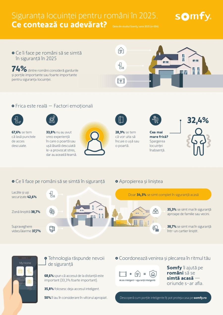 Studiul Somfy dezvaluie o realitate clara: romanii nu isi doresc doar securitate tehnica, ci liniste sufleteasca. Teama de a uita o usa deschisa (28.9% dintre respondenti) si teama de a nu putea reactiona de la distanta (20.1%) reprezinta probleme reale care pot fi rezolvate prin solutii smart moderne.