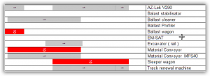 • Activitati predefinite, cu resurse alocate si randament calculat in functie de utilajul folosit (semnalizare si electricitate, clipping traverse, ridicarea sinelor si curatarea balastului, taierea si inlocuirea sinelor vechi de cale ferata, compactare si stabilizare, suduri)
