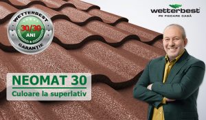 Wetterbest, unul dintre liderii industriei locale de sisteme pentru acoperisuri, a lansat NEOMAT 30 — noua protectie pentru acoperisuri, ce ofera o garantie de 30 de ani atat la coroziune, cat si la culoare. Neomat 30 este cea de-a doua protectie pentru acoperisuri lansata de Wetterbest, dupa SUPREM50, iar garantia de 30 de ani la culoare este cea mai mare garantie disponibila in piata de profil.