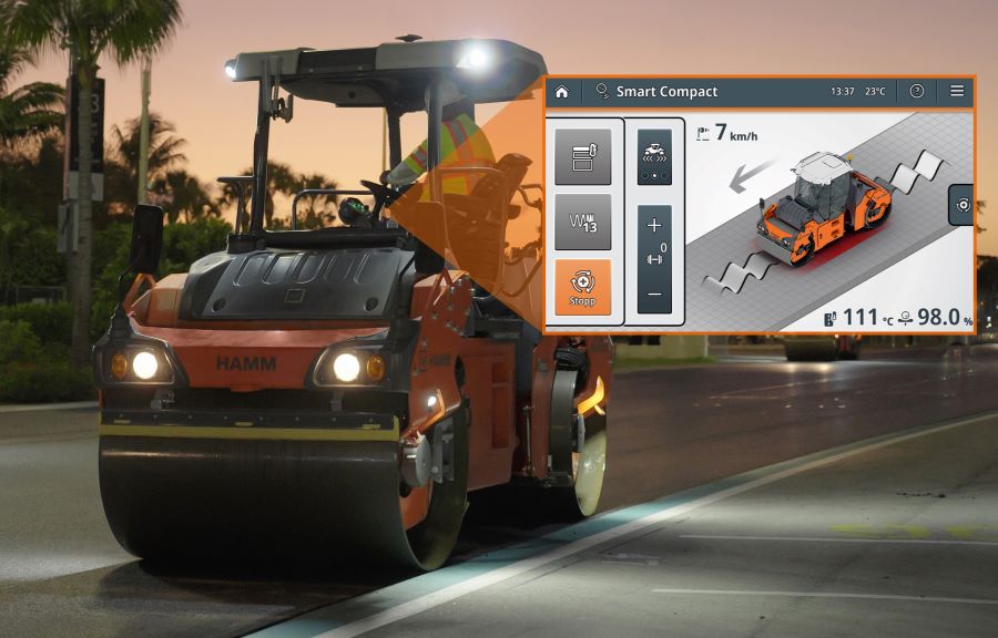 At Hamm, the focus is on the automation of compaction processes. For instance, the already familiar Smart Compact Basic has now been expanded to include the decisive parameter for quality assessment during compaction: the real-time asphalt density. This is determined on the machine by the new Realtime Density Scan in the Smart Compact Pro system and forms the basis for automated regulation of the compaction energy and compaction modes in both drums of the HD+ and HX series tandem rollers. This enables the roller driver to constantly monitor the development of the density in real-time, even during static compaction.